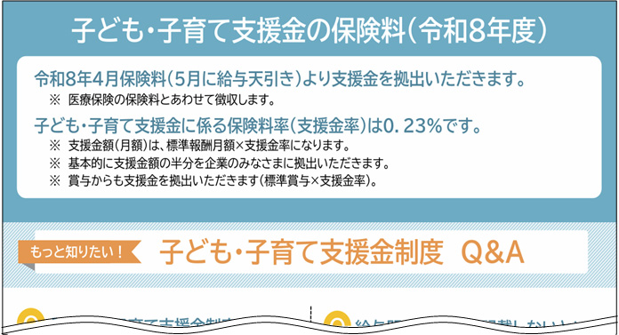 子ども・子育て支援金制度による「子ども・子育て支援金」の徴収が、令和8年4月から(給与天引きはその翌月から)スタートします。こども家庭庁から公表された事業主向けリーフレットを確認しておきましょう。
